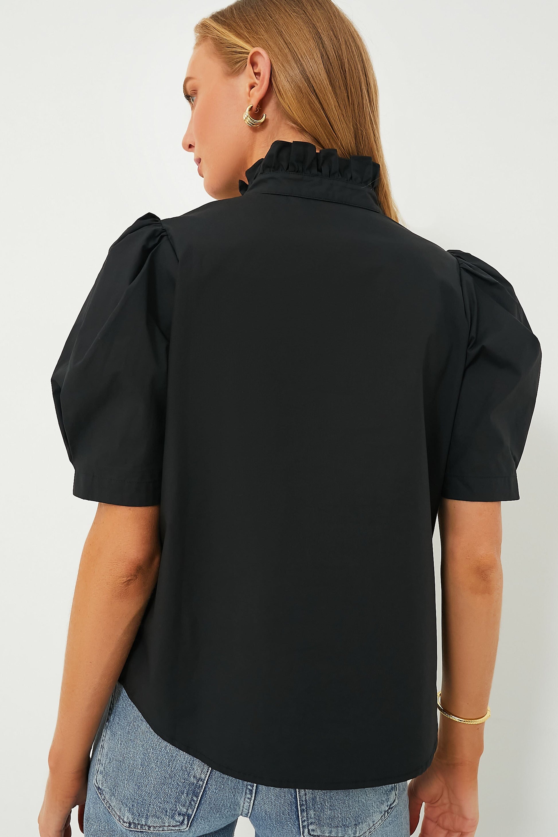 The Alicia Blouse is defined by it's puff sleeves, ruffled stand collar, and a timeless black colorway. Cut in the perfect length that looks great tucked in or left out, this effortlessly polished piece is great for year round wear thanks to its versatile styling options. Pair this feminine number loose with your favorite jeans and sneakers for running errands or tuck it in with trousers and ballets for a polished yet chic look at work.