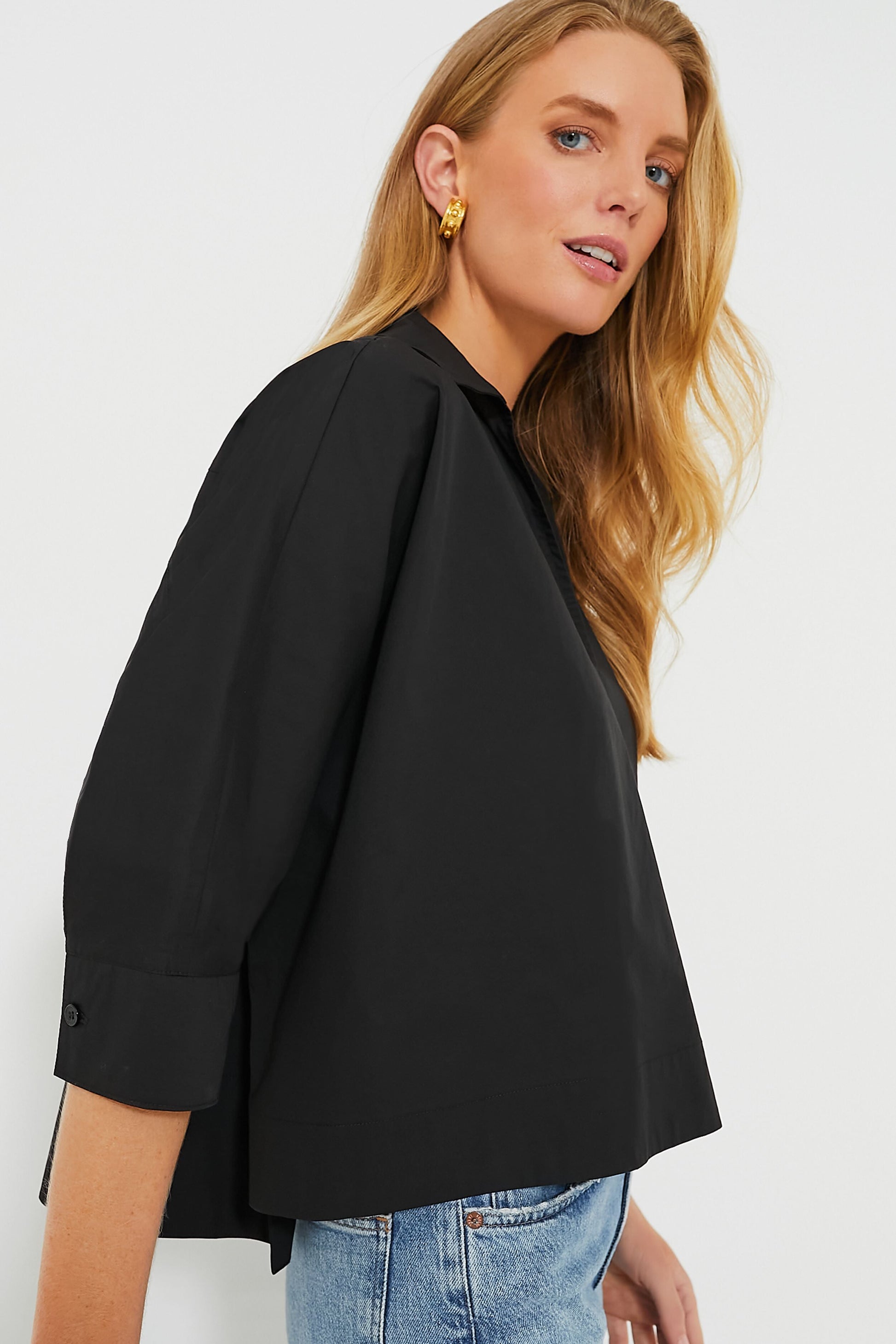 Classic, sleek, and effortless, the Black Polo Popover is the easy style that we know will live in your closet for years to come. Featuring a slightly cropped boxy silhouette, flattering collared V-neck, and three-quarter length batwing sleeves, this sophisticated number is perfect for an elevated daytime look or for cocktail hour. We are pairing it with denim of all colors and flats for year round styling.