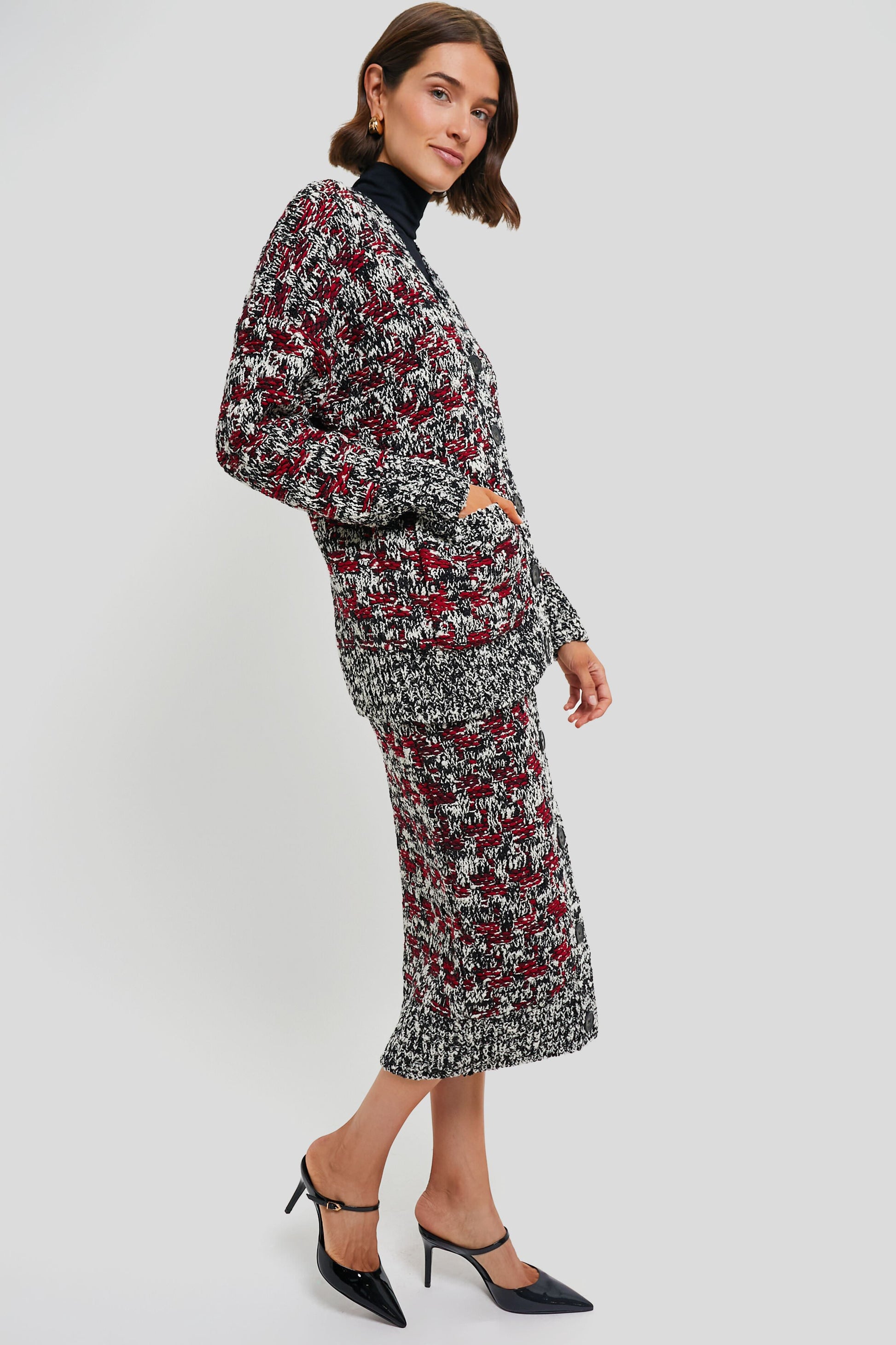 Classic meets modern in the Black White and Plum Pencil Midi Skirt. This chunky-knit skirt is spun from pure merino wool in a houndstooth pattern. It combines hues of black, white, and red to create a boucle effect inspired by mid-century three-piece suits. We are styling this with a black tank, the matching Black White and Plum Oversized Cardigan, and heels for an absolutely chic ensemble.