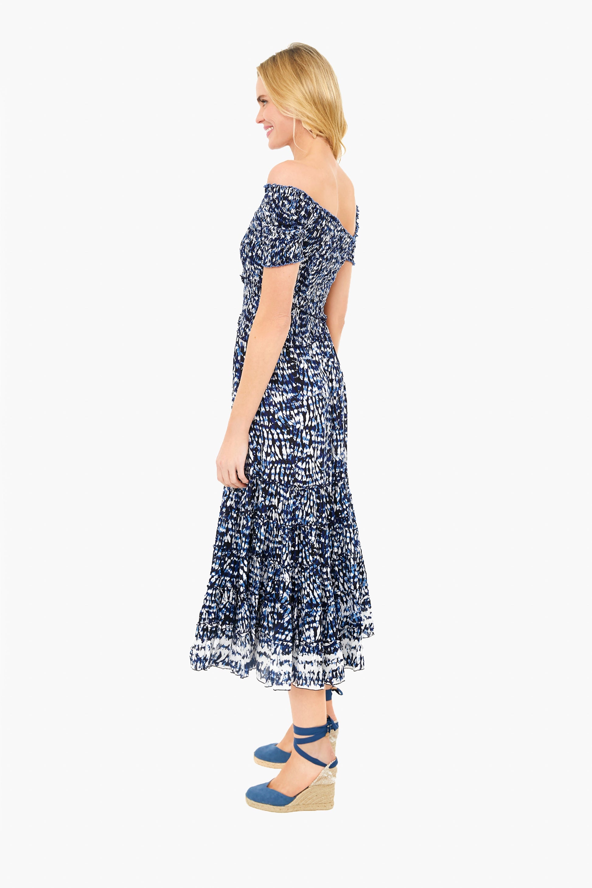 The Blue Tiedye Soledad Midi Dress features a smocked bodice and full, shirred skirt. Glamorous and bohemian, this style works well as a caftan or easy day dress when paired with raffia accessories and sandals!