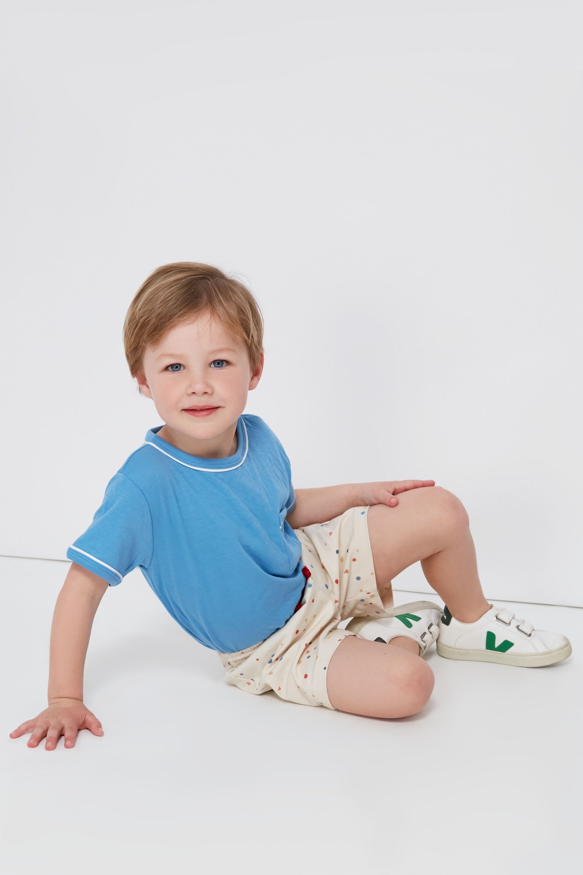 The Blue Willie T-Shirt is the perfect kid's tee. Cut from a beyond soft jersey fabric, this top will quickly make its way to your child's favorite piece in their closet. The contrast piping and unisex design make it an essential mix and match wardrobe staple for school, weekend adventures, family get-togethers, and everything else in between.