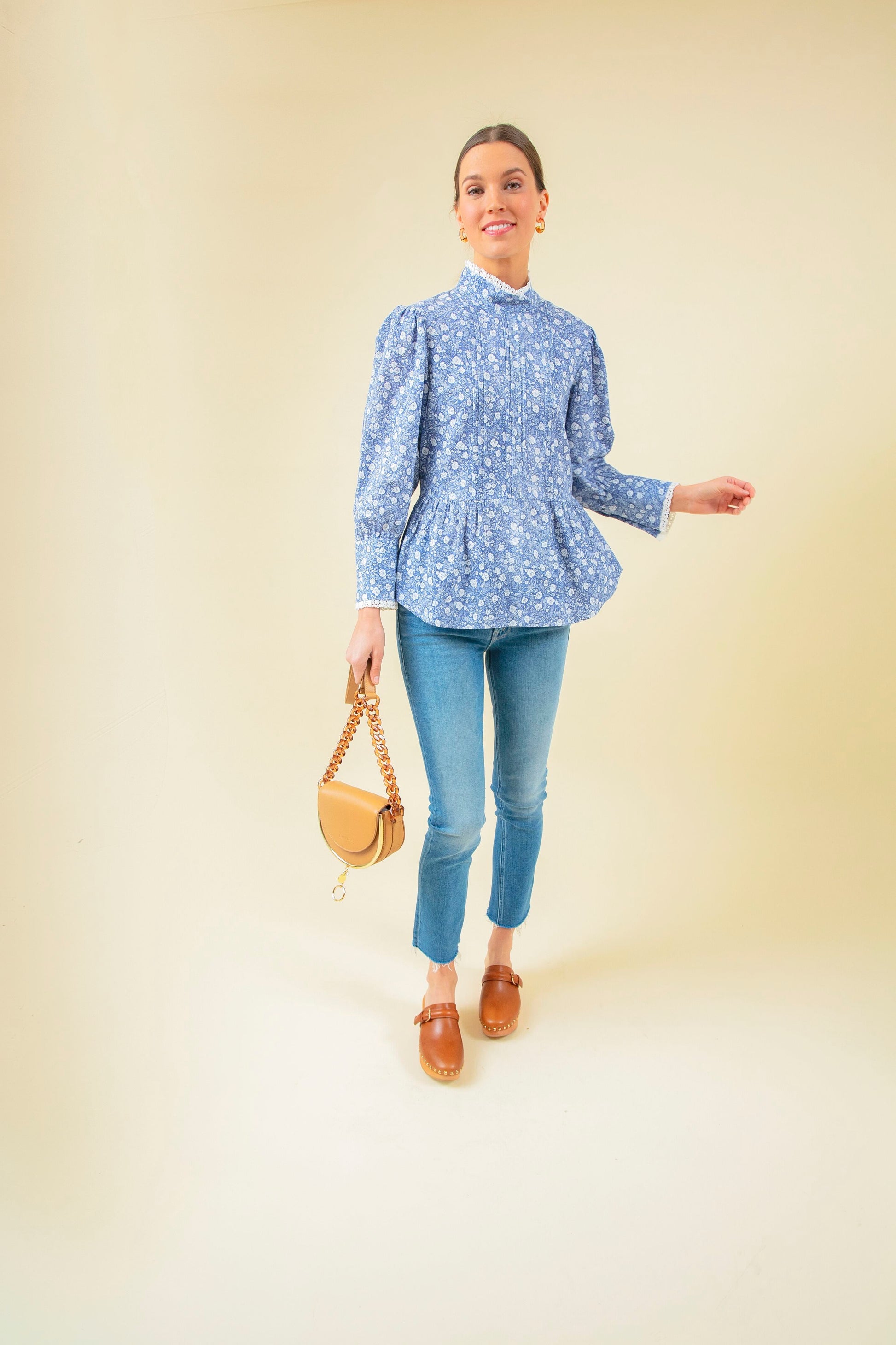 The Corsica Clog is made in Italy from cognac vacchetta leather, which sits atop a wooden base and is finished with brass detailing along the edge. Perfect for fresh looks, we are pairing these with denim and feminine blouses.