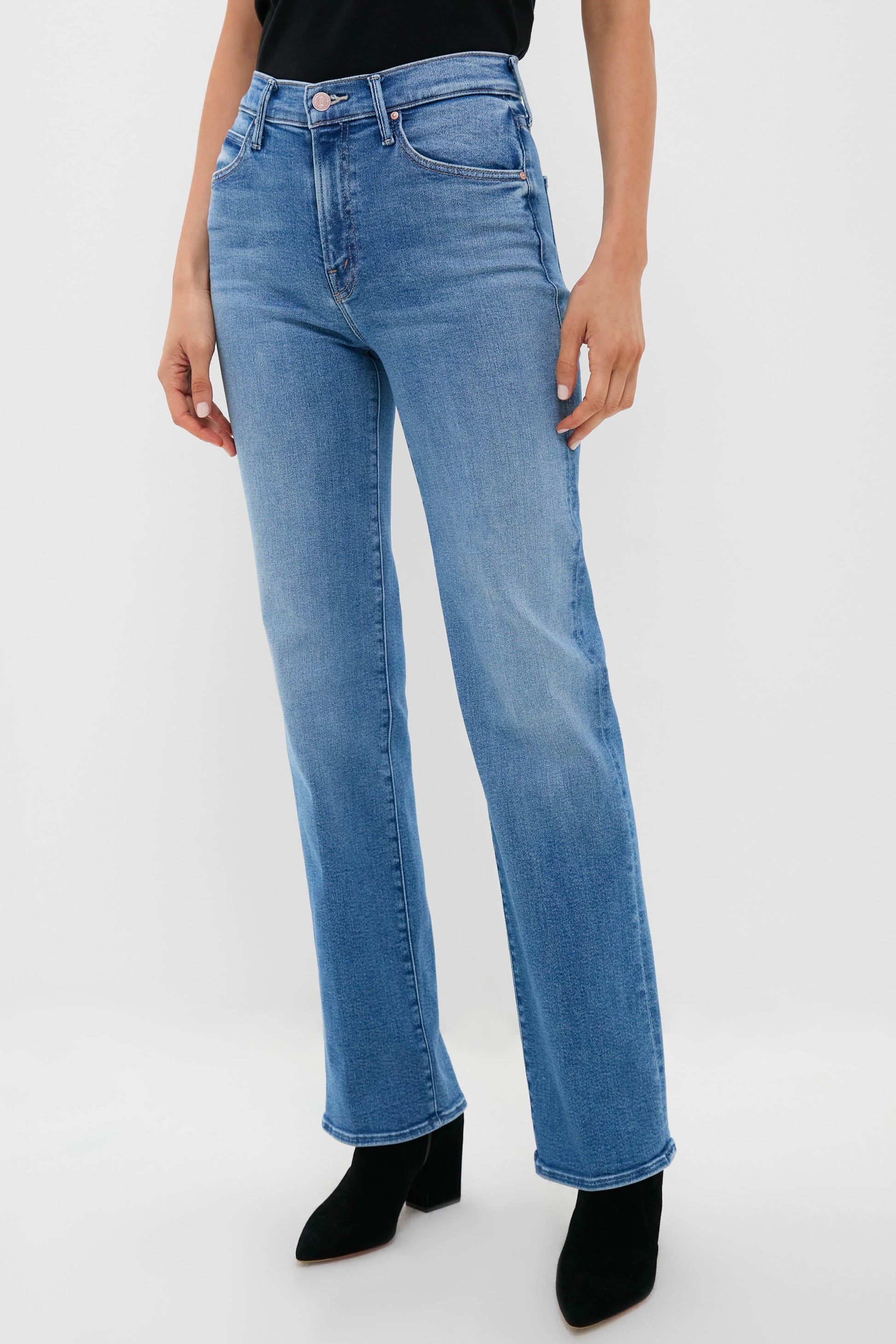 With a high-rise, straight leg, and a clean hem, the Fan Favorite The Kick It is sure to please. Cut from stretch denim, Fan Favorite is a mid-blue with whiskering and fading at the knee. Pair with a tee or sweater, boots, and your favorite fall accessories for a pulled together look.