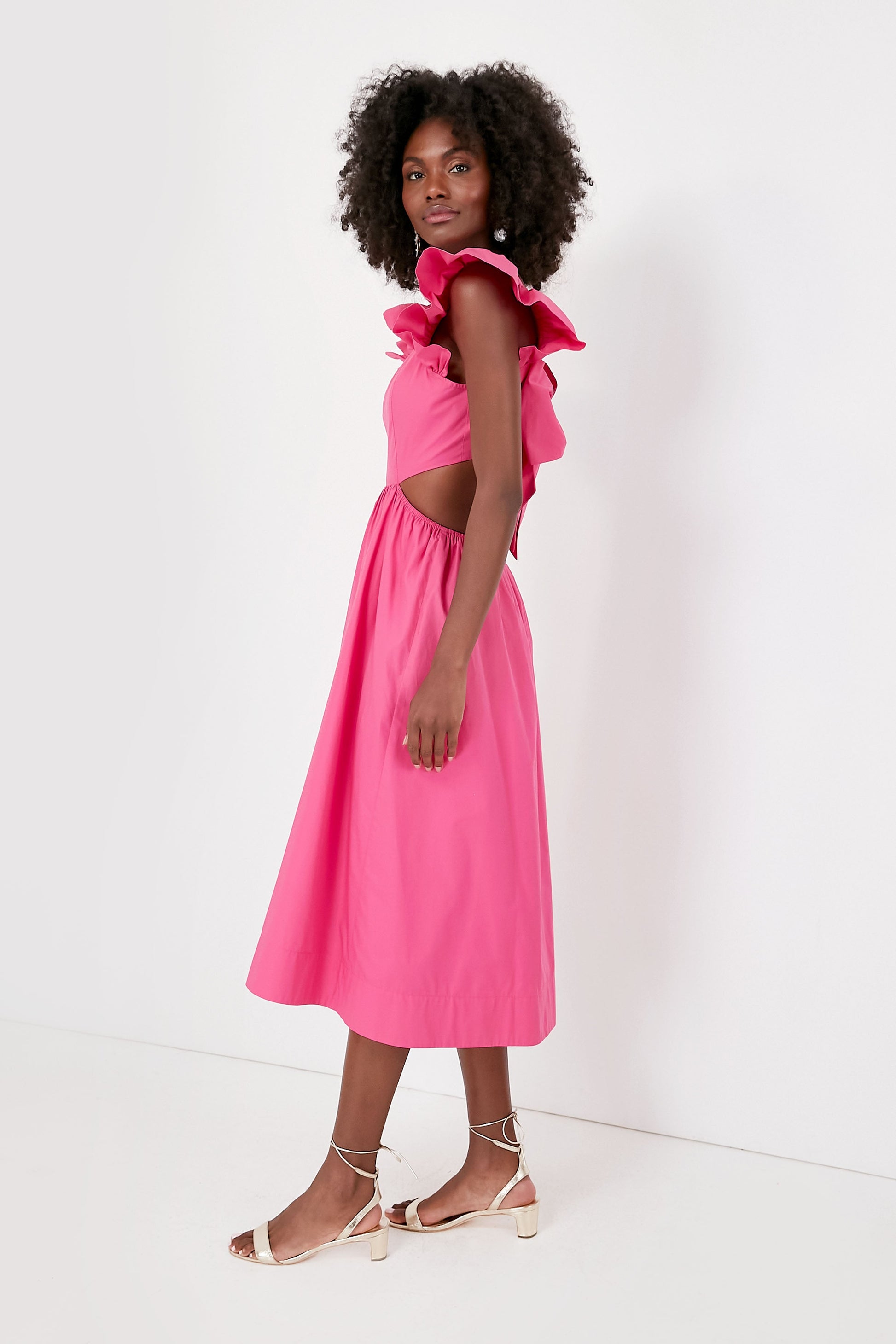 It's hard to pick our favorite detail of the Aspyn Dress. Featuring a square neckline, ruffle sleeves, cut outs and a tie back design, this fuchsia frock is the easy choice for elevated events this season. Pair with simple gold sandals and a brightly colored clutch for a look sure to brighten any room.