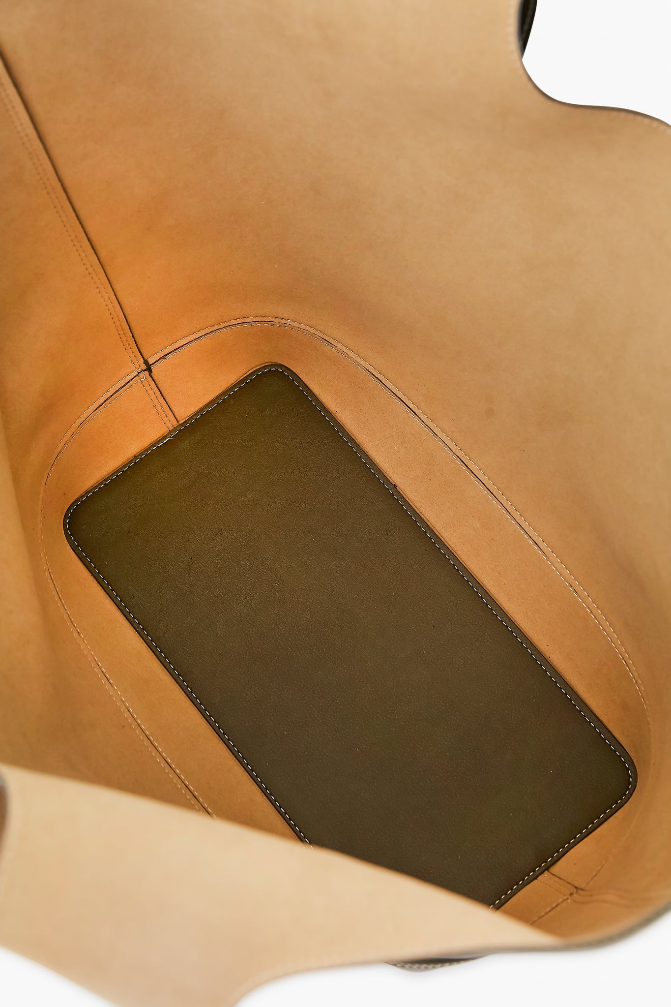 The Mask Bag is a timeless and versatile piece that is perfect for the office, weekends, and travel. Lightweight and big enough to carry your essentials plus a notebook, this tote has a structured bottom, smooth leather, and contrast stitching. Tie the side straps for an elegant, minimalist shape when out on the town for the day!