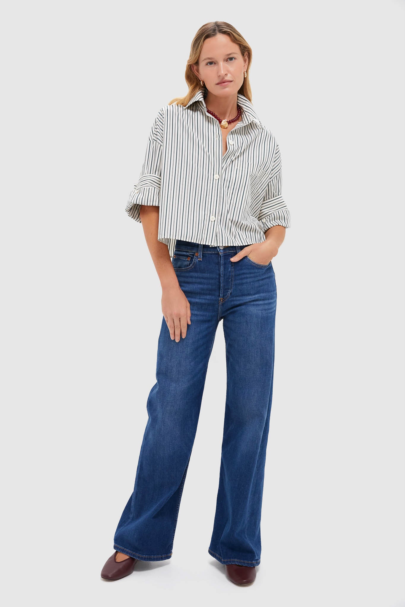 The Next Ex shirt is a cropped, boxy silhouette complete with a chest patch pocket, spread collar, and TWP's signature double roll button cuffs. Pair with denim and sneakers for a step up from casual, or with with a maxi skirt and sandals!