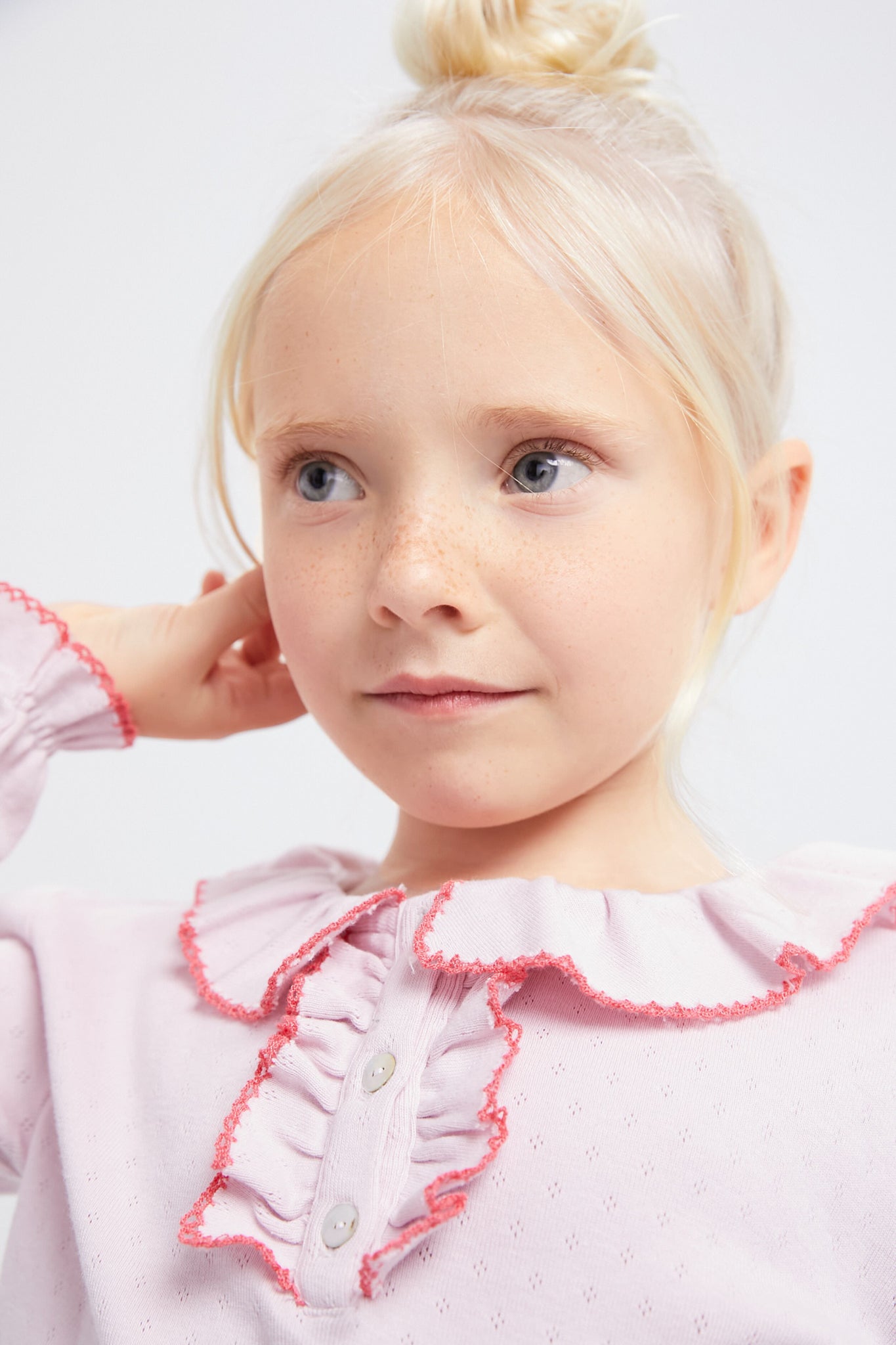 The Lilac Mirette is a lovely fancy t-shirt boasting a gathered collar and polo-style placket surrounded by a pretty little ruffle. Crafted from pointelle organic cotton, this oh-so adorable top has charming details like contrast embroidery on the collar, ruffles and bottom sleeves, making it an easy choice for layering under cozy jackets or pairing with jeans and boots for crisp autumn days.