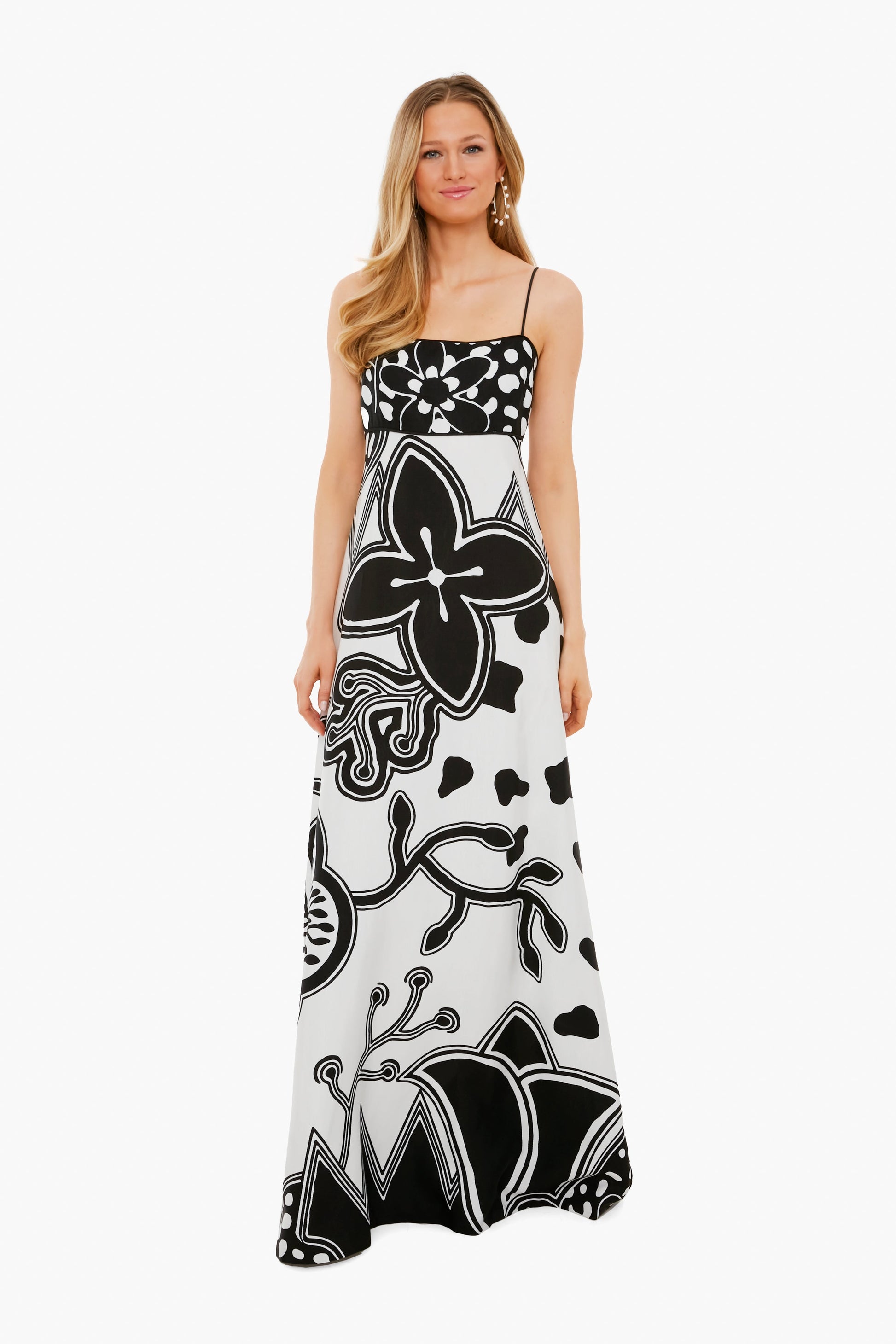 Make a statement this season with bold, oversized graphics. Cut in a printed twill, this baby doll gown features a square neckline, thin straps, and black piping details. Style with heels and pearl jewelry and you are sure to be the best-dressed guest!