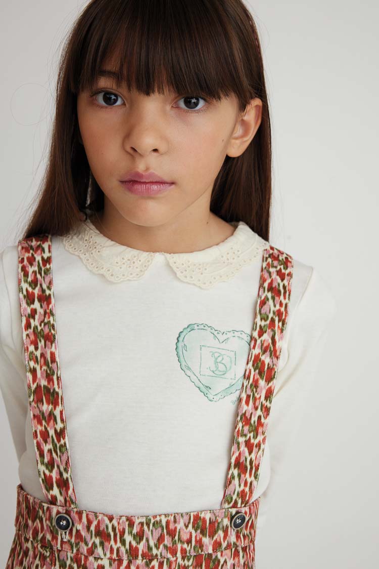The Lyra skirt in adorable painted hearts print in red, pink, and green and crafted from softest cotton. Timeless style features pleated skirt, zip on the side and crossed suspenders. Pair with a tee or sweater for adorable looks.