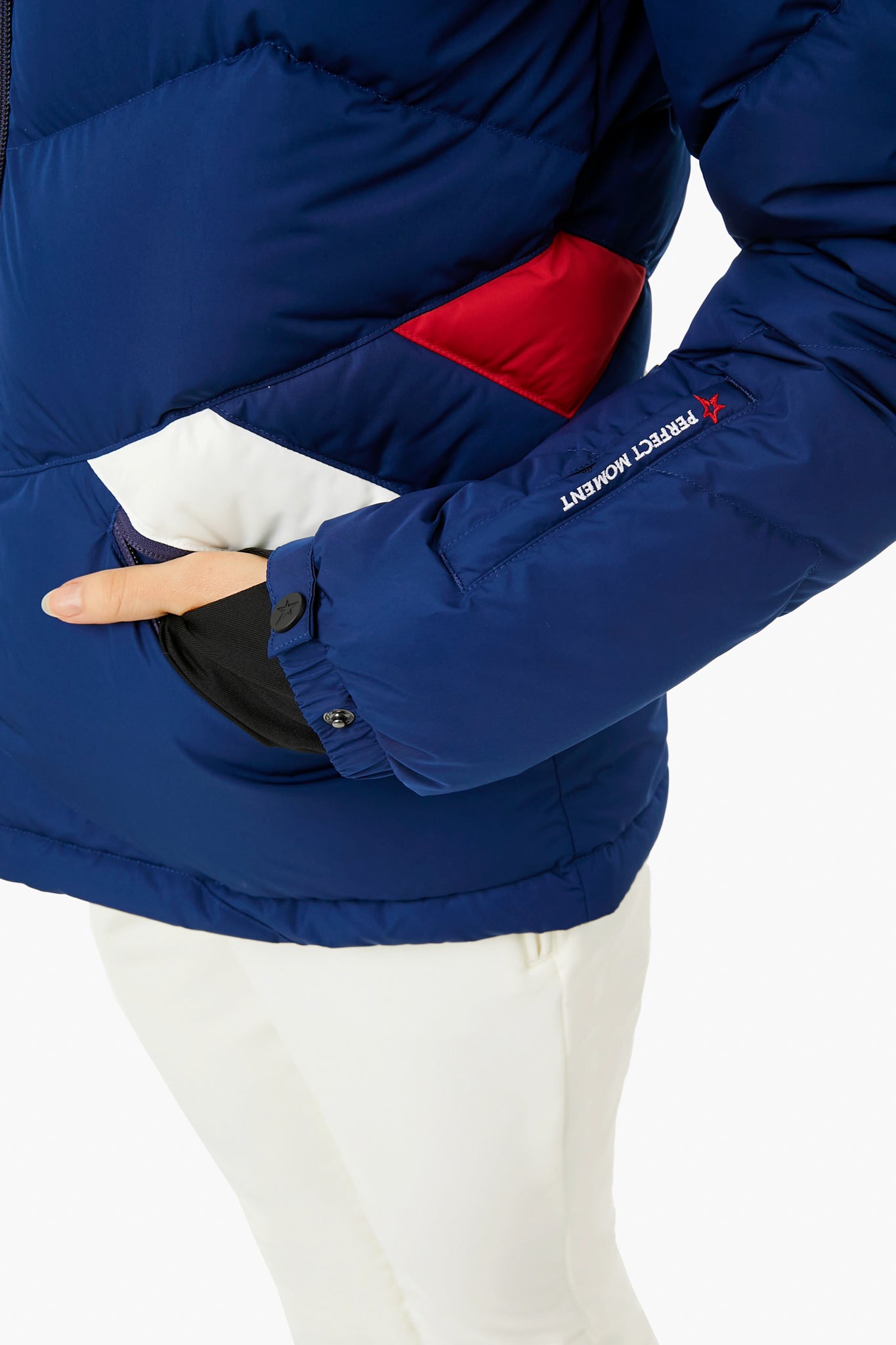 Perfect Moment's Apres Ski Jacket blends elevated style with performance-wear. Featuring water-resistant and breathable fabric with insulating natural down padding, this jacket is bold and sporty. This jacket will keep you warm while you find the fun this season!
