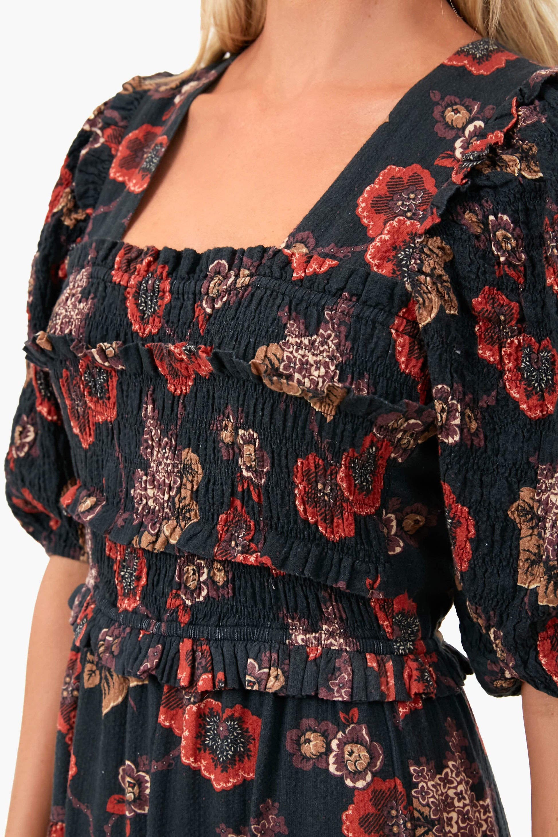 The Navy Lucinda Seersucker Puff Sleeve Smocked Dress combines textural aspects with a bohemian print to create a dreamy and dimensional midi. Puff sleeves and layered shoulder ruffles make for a voluminous silhouette, while side seam pockets make this a functional go-to piece you will wear again and again. Perfect for transitioning to fall, style with sandals for warm weather, then wear with boots as temperatures cool.
