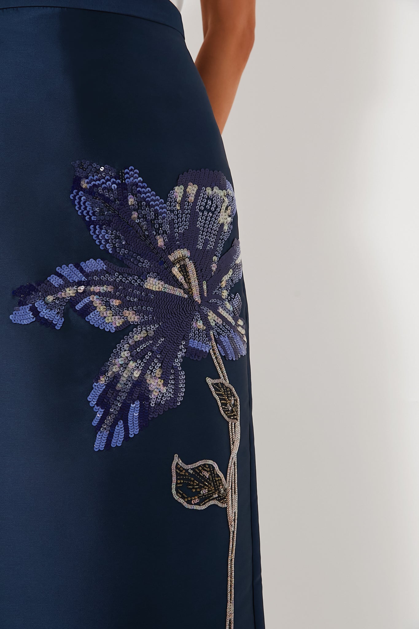 Florals count as a neutral in our closets, and this Navy Midi Length Pencil Skirt offers a decorative take on classic blooms. It is embellished with an oversized flower made up of thousands of hand-placed beads, and is cut from navy Mikado which has a subtle, elegant sheen. We are styling this beauty with a black body suit and heels for date nights, and with a sweater and heels for winter soirees.