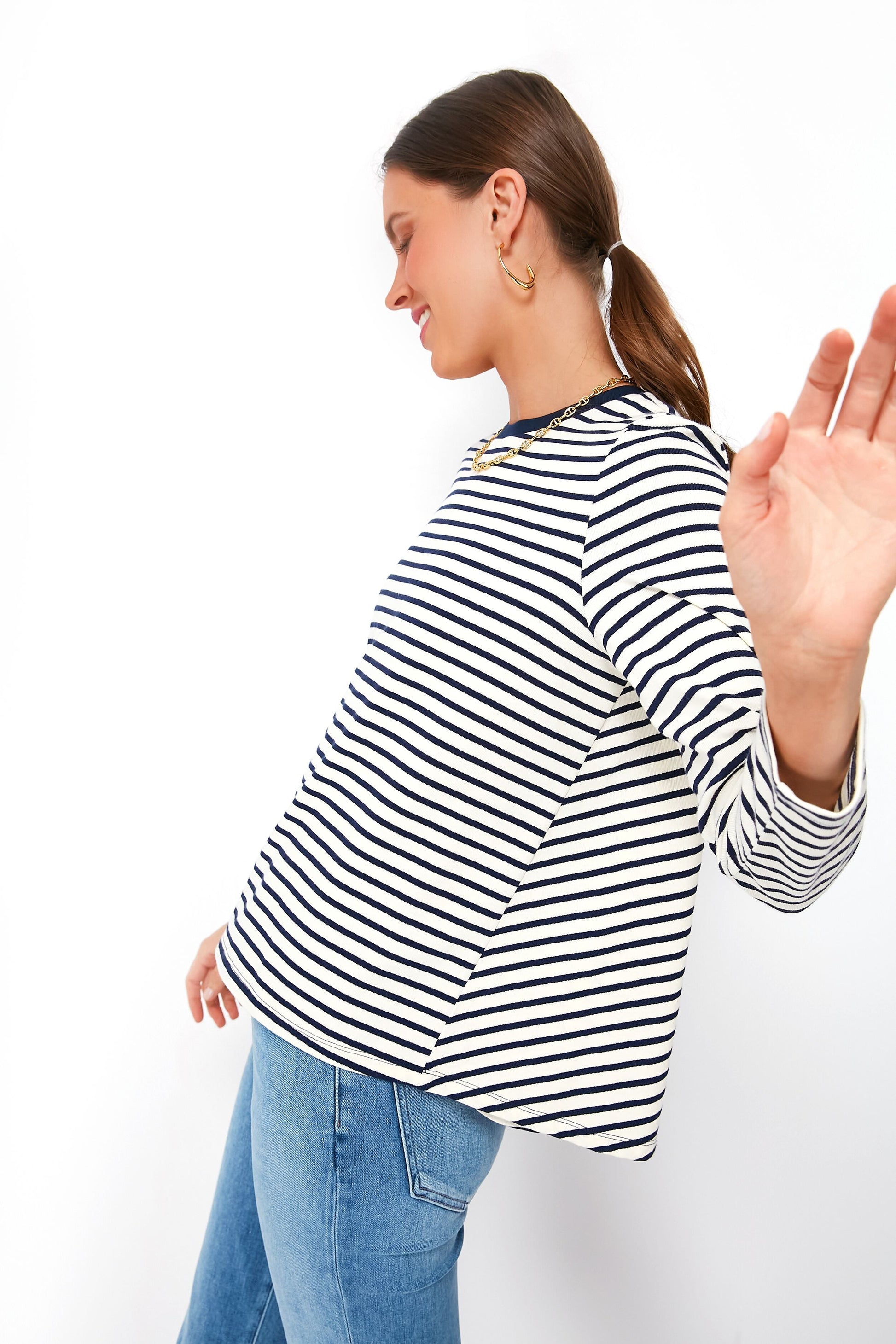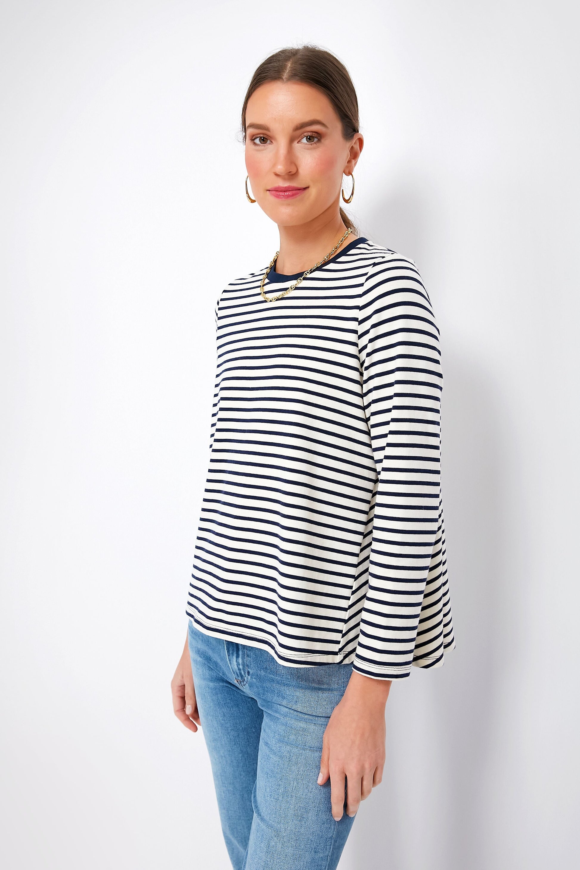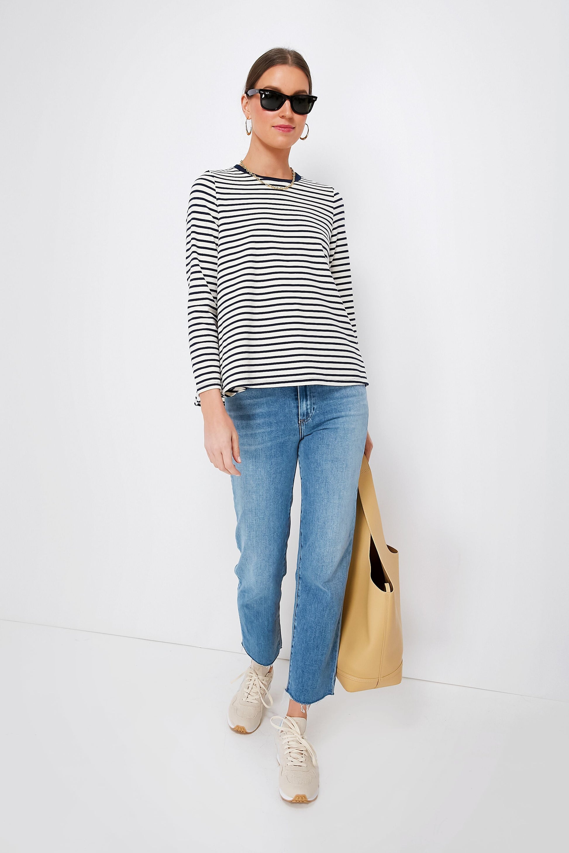A trendy swap for your go-to t-shirts, the Wells Tee adds a little something extra to your dressed down days. Cut from a super soft cotton blend, this white and navy striped long sleeve has a comfortable vintage feel while the relaxed, straight fit guarantees this to be in your wardrobe for years to come. We are pairing this with denim and sneakers for running errands on low key days and adding a crisp button up overtop for a fun play on layering for brunch with friends.