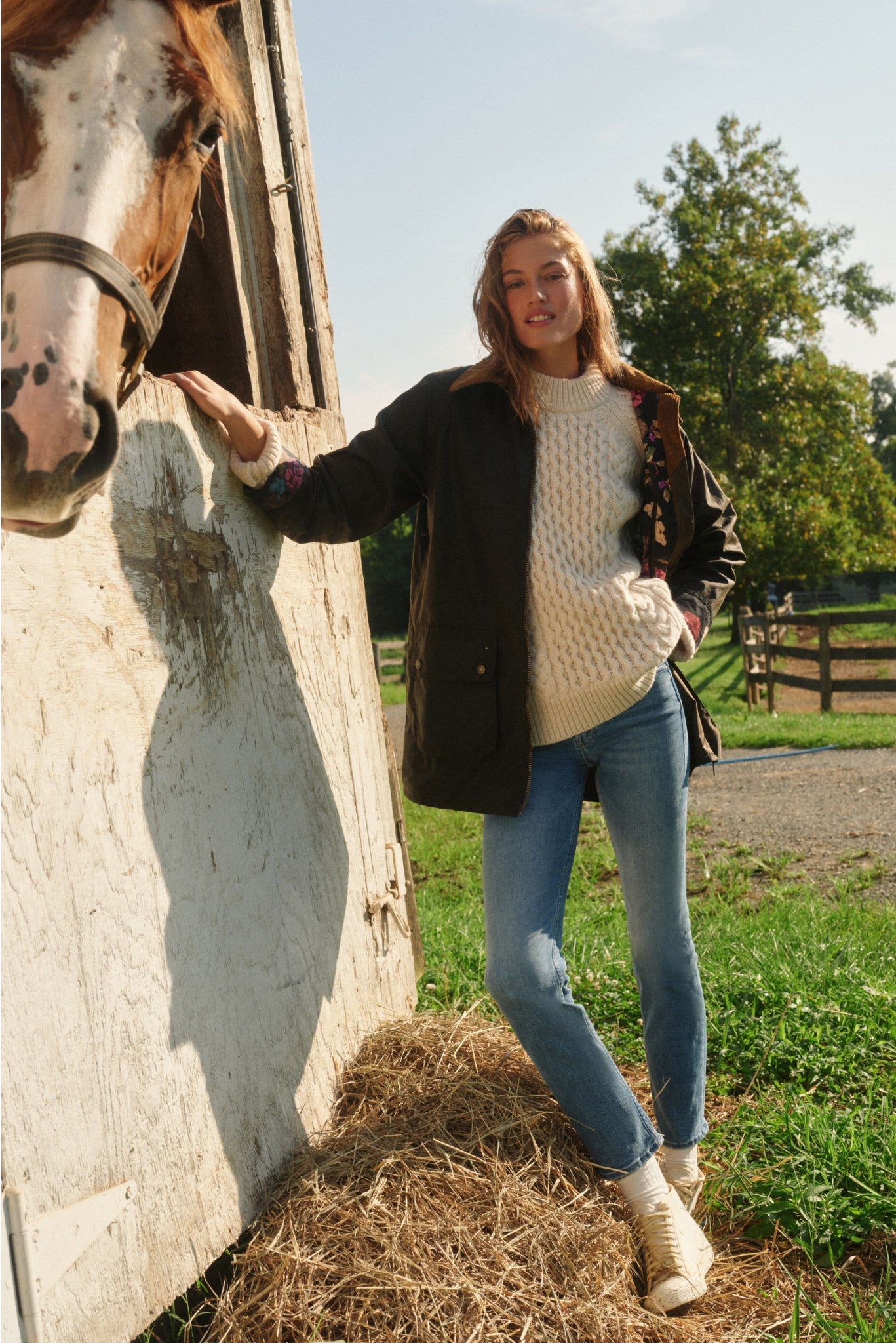 The most classic piece in this limited-edition collection, the Elodie wax takes inspiration from Barbour’s beloved Highclere jacket. Reminding us of the coats Queen Elizabeth II wore during visits to Balmoral Castle, this long, all-weather jacket is made in Barbour’s iconic archive olive wax, allowing it to withstand wind, rain, and your busy schedule. It’s practical with its detachable hood and handy D-ring, but the Baroque Floral lining adds a touch of whimsy.