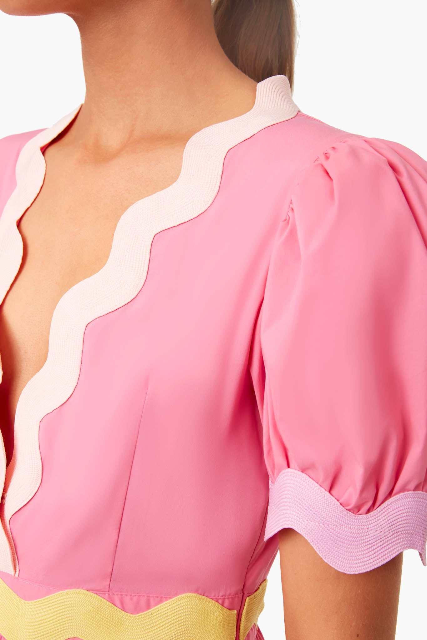 The Piscis Dress features a v-neckline, short puff sleeves, and colorful ric rac trim. Made from the perfect palette of sherbert-inspired hues, it can be paired back to sandals or heels. From vacation dinners to days spent exploring a beachside town, this style will be comfortable and chic.
