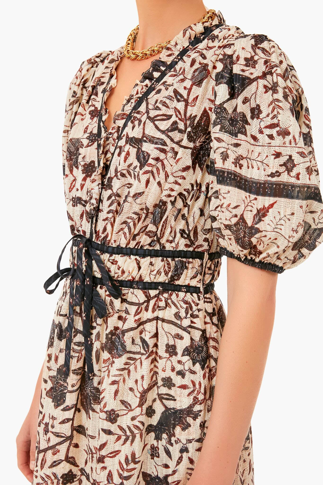 The Annisa Dress is cut in the Bird of Paradise soft cotton shirting, which features multiple artworks of flora and fauna, pieced together as a single eye-catching print. This puff-sleeve dress features a wrap-style bodice with an open neckline and nipped-in elastic waist. The tiered skirt is finished with a delicate ruffled hem.