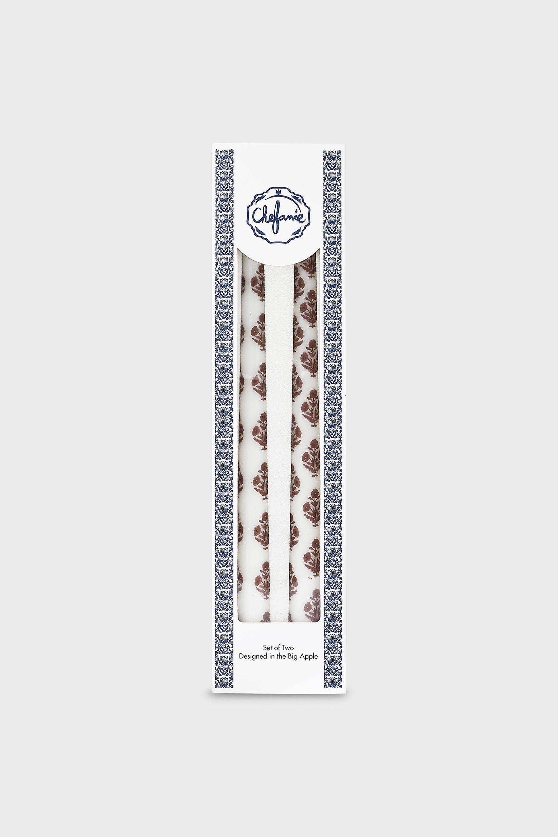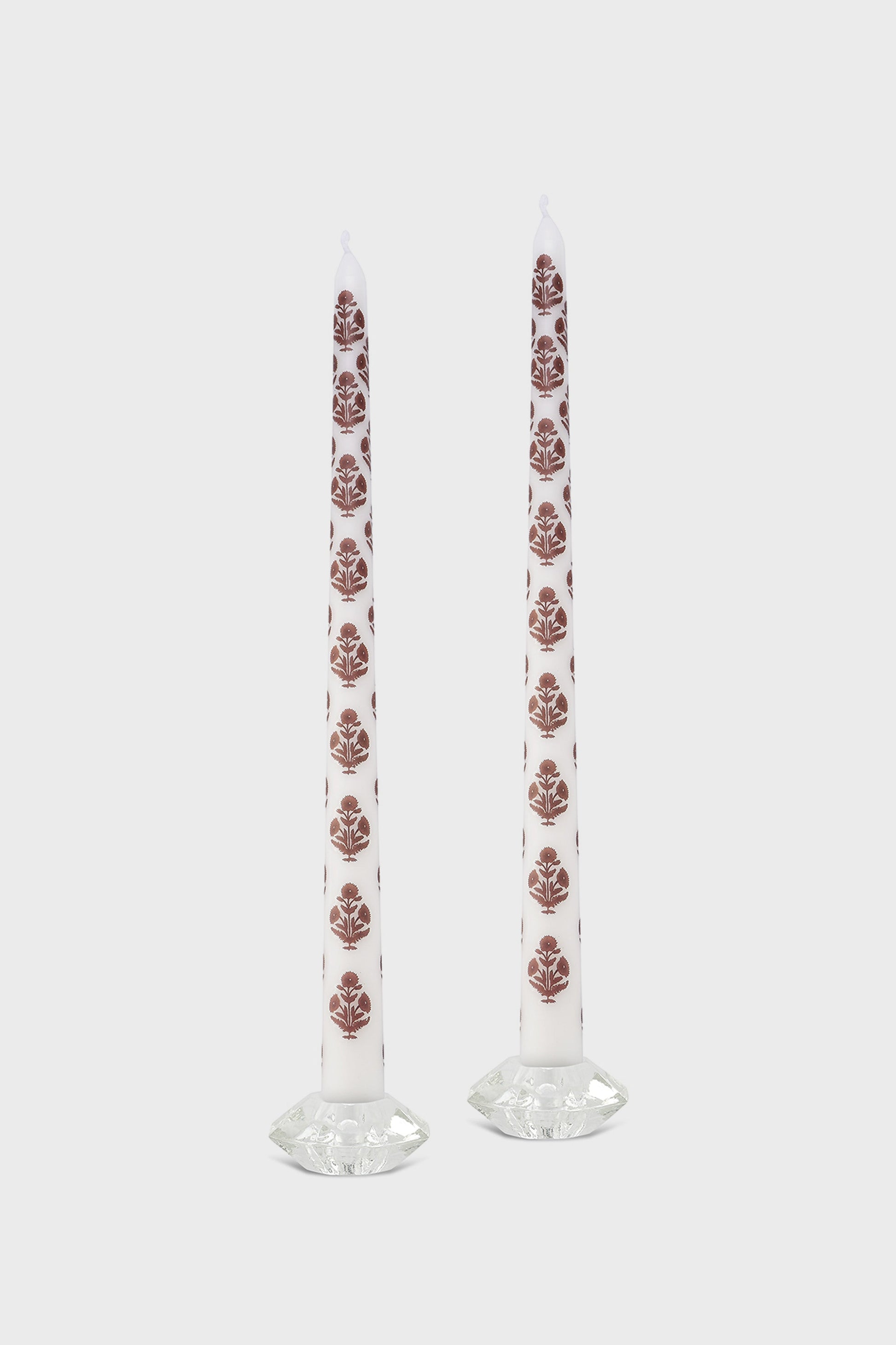 This set of 2 unscented taper candles is decorated to look like a brown block printed poppy, and add a bit of color, charm, and elegance to any tablescape.