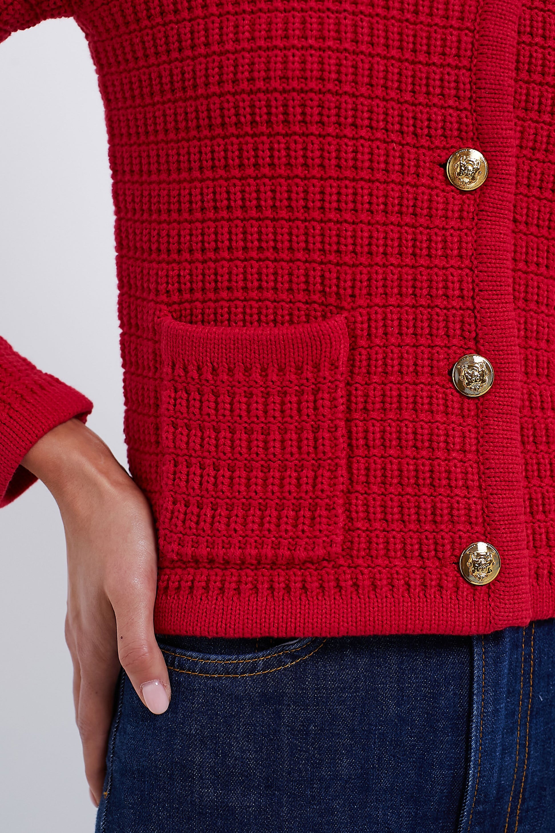 The Red Woven Maybourne Cardigan is a closet must-have. The knitted body is comfortable and versatile, while the gold buttons and structured silhouette elevate it to the next level. Perfect for work meetings, coffee dates, brunches, and beyond, this will be your new favorite style. Pair with denim and flats or a skirt and heels.