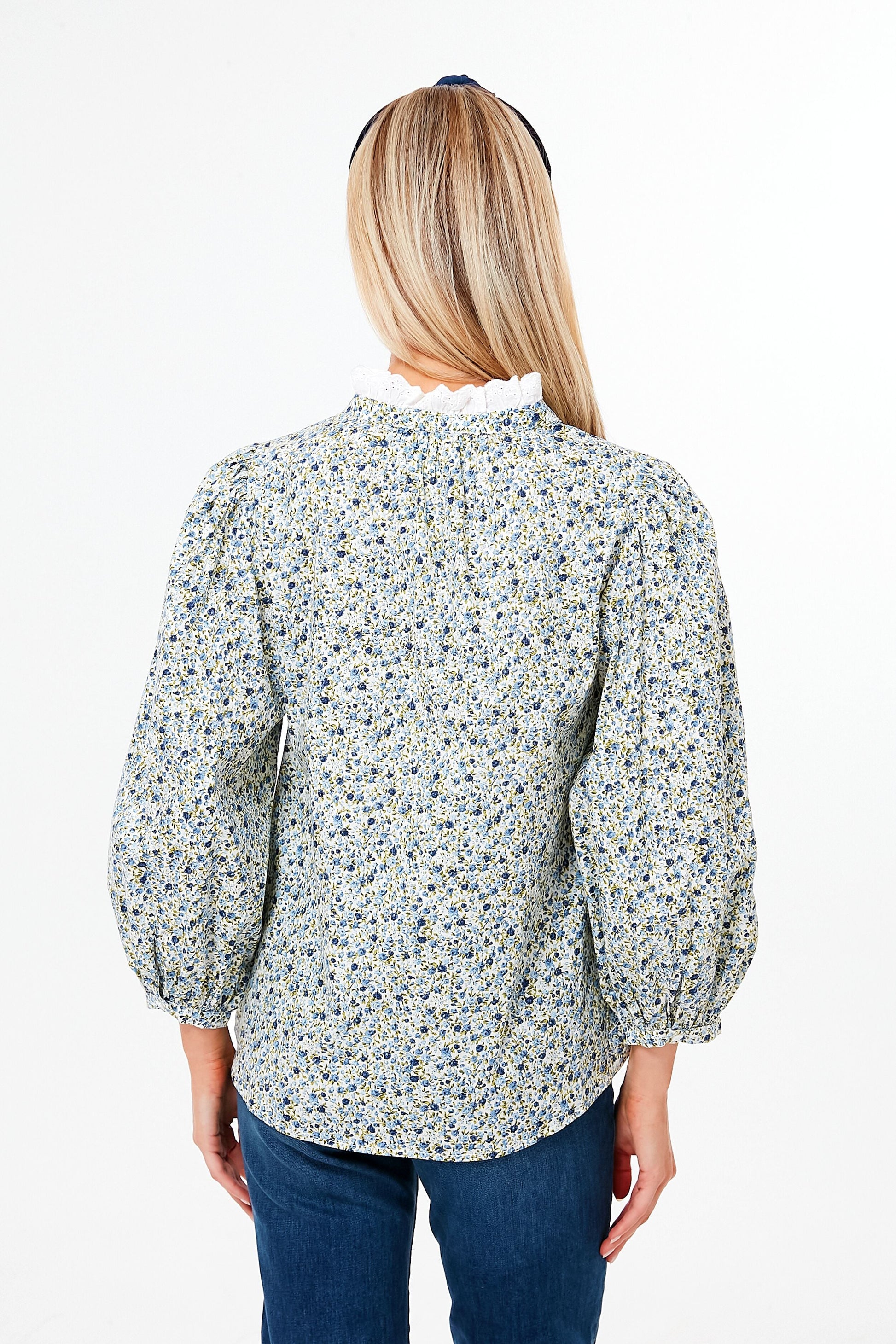 The delicate ditsy floral of the Ruffle Collar Conley Blouse is elevated by the subtle puff sleeves and lace detailing. The cool tones of the floral print are perfect to pair with dark wash denim as the seasons turn cooler. Style with leather platforms and a crossbody for a lunch date, or swap for your favorite booties for an outdoor concert!