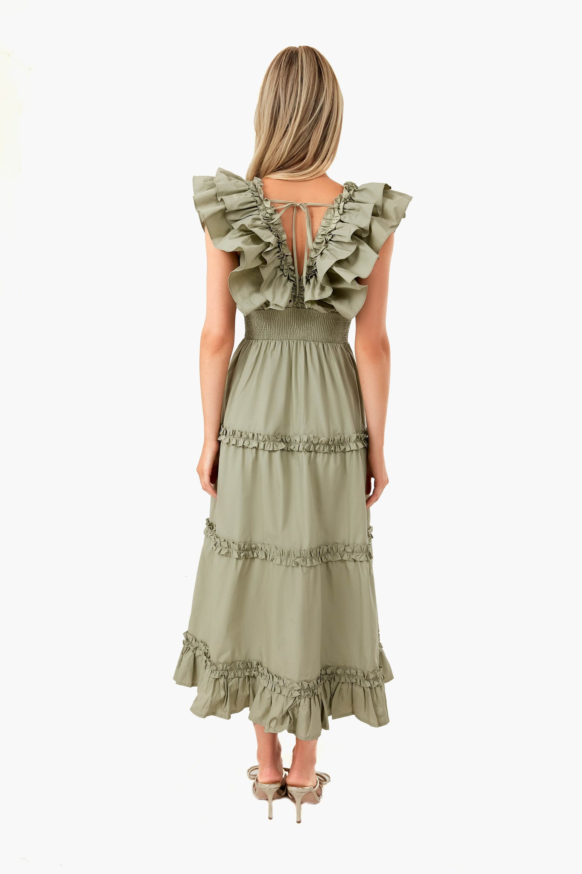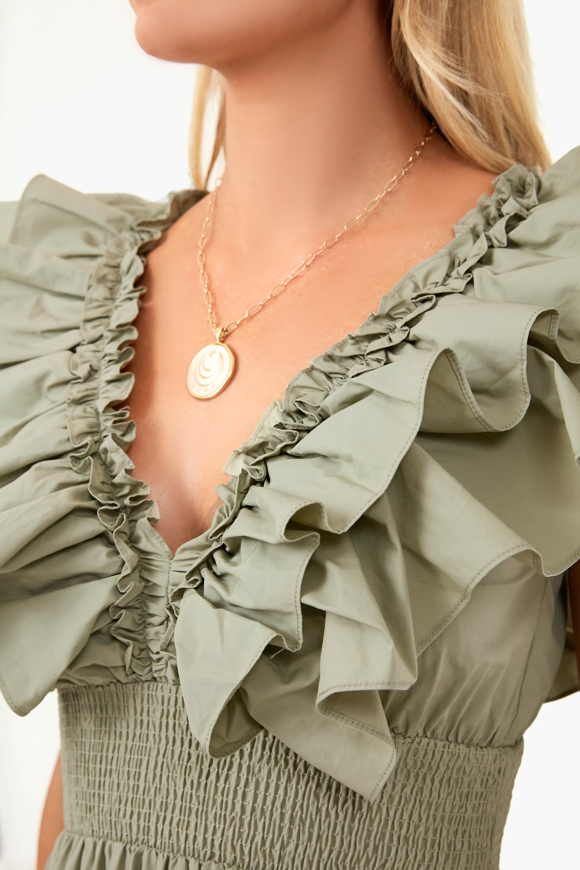 The Sage Construct Dress combines a fresh, muted green cotton poplin with dimensional ruffles to create a flirty and romantic midi. Featuring flutter sleeves, frilled seams, and a tiered skirt, this feminine silhouette will add elegance to your closet. Wear with sandals and sunglasses for a picnic in the park, or pair with gold jewelry for happy hour.