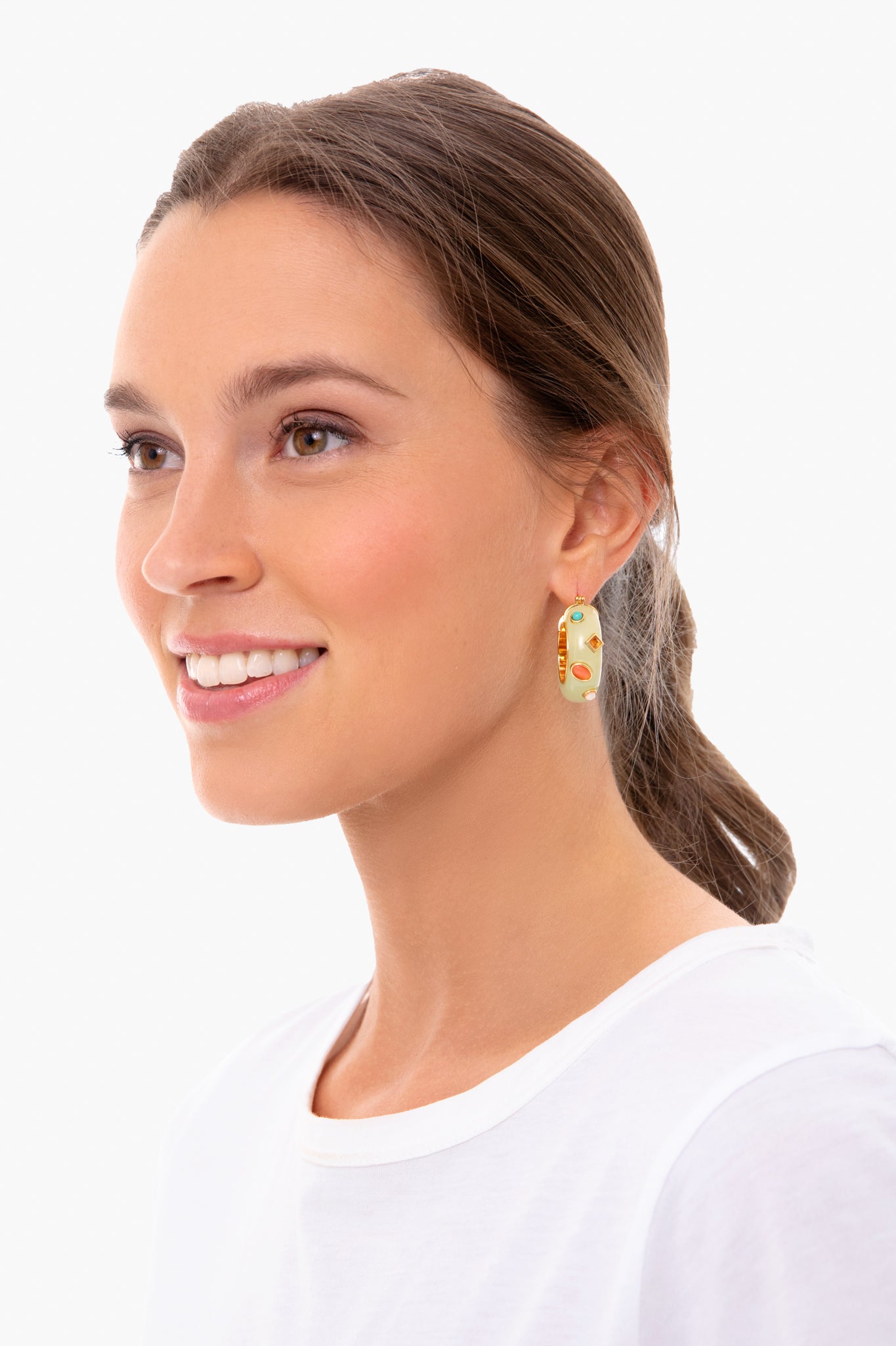 The Sea La Bomba Hoops have turquoise, citrine, coral, and mother-of-pearl set in aqua acrylic. Whether paired with your favorite sweater or a dress, these small stunners are sure to elevate any outfit.